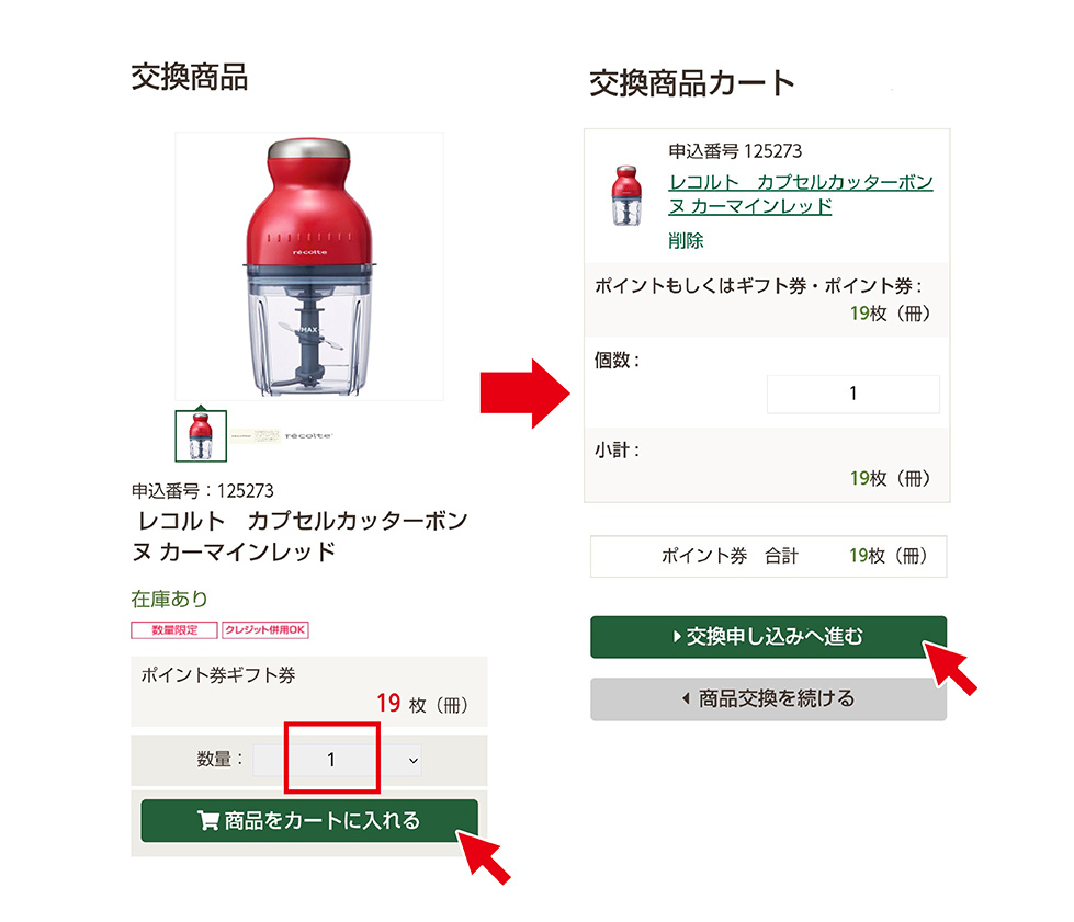 交換したい商品の数量(個数)を選択して【商品をカートに入れる】ボタンを押し、カート内を確認したら「交換申し込みへ進む」ボタンを押してください。