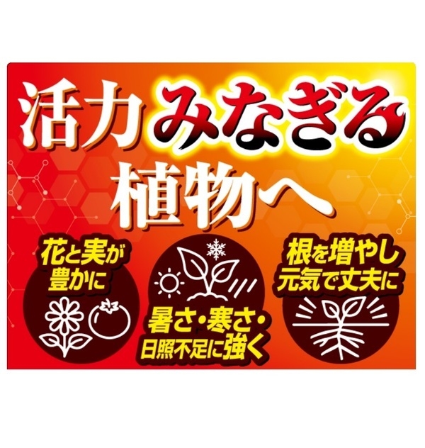 ビール酵母抽出物、酢酸カルシウム、アミノ酸、マルチミネラル、ビタミンB群の5つのパワー成分で植物の生命力をひきだします。