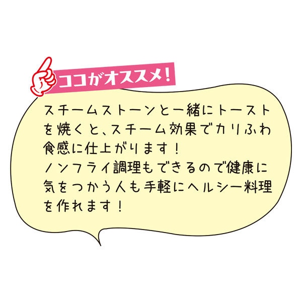 ピザストーンの遠赤外線効果で、石窯焼きの様なカリッ&もっちりな仕上がりに!ストーンは水洗いできるので、毎日清潔に使えます。