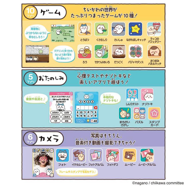 写真や動画が撮影できるカメラ・ちいかわたちと電話やメッセージ・心理テストやナゾトキ・10種のミニゲームなど、